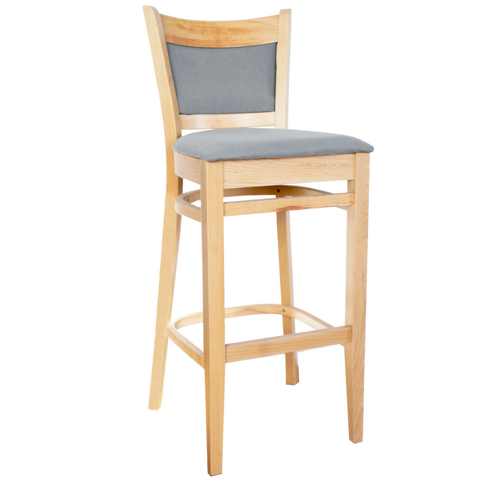 Hoker bukowy z tapicerowanym siedziskiem i oparciem.