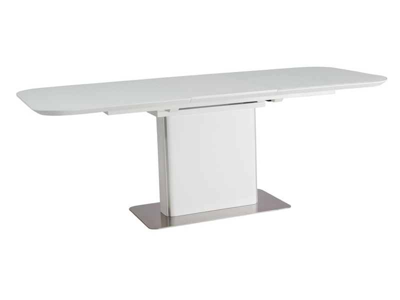 Stół rozkładany, blat: szkło hartowane+MDF, podstawa MDF+stal szczotkowana, kolor: biały+biały mat