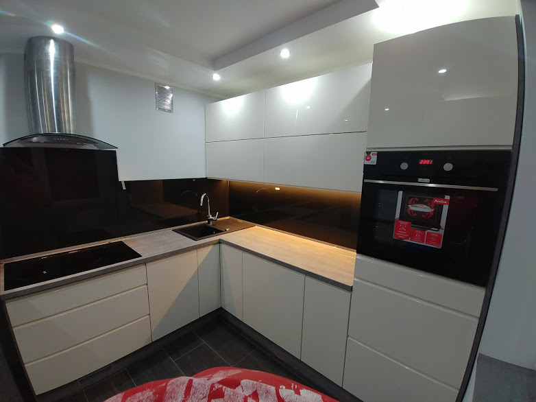 Kolejna realizacja z zakresu mebli na wymiar którą pragniemy Państwu przedstawić to kontrast idealny. Bardzo modną i popularną kompozycją na przełomie kilku ostatnich lat, stała się opcja białych frontów wraz z czarnymi dodatkami. Jest to zestaw kontrastowy który idealnie wkomponuje się w każde wnętrze i wykończenie.