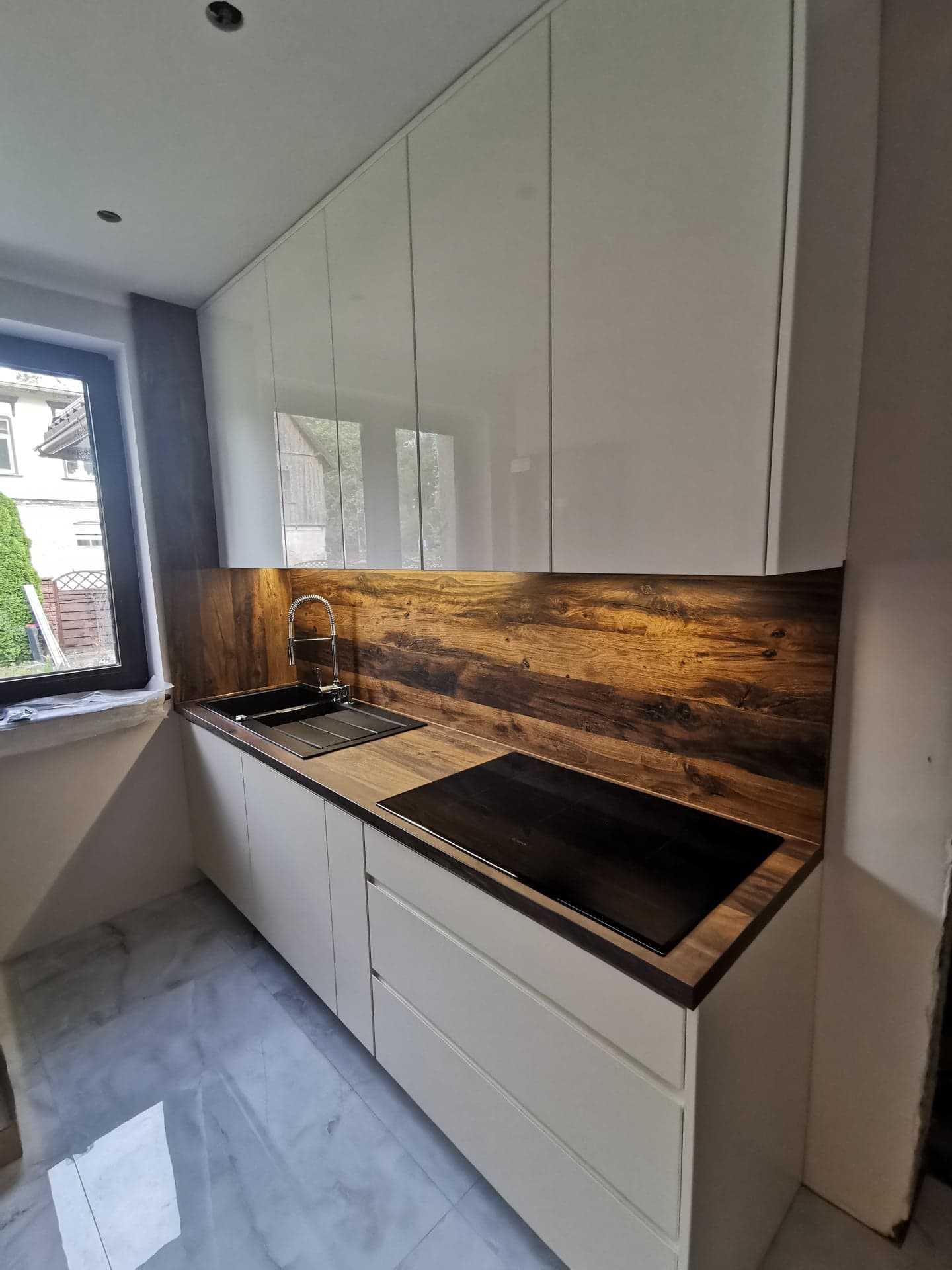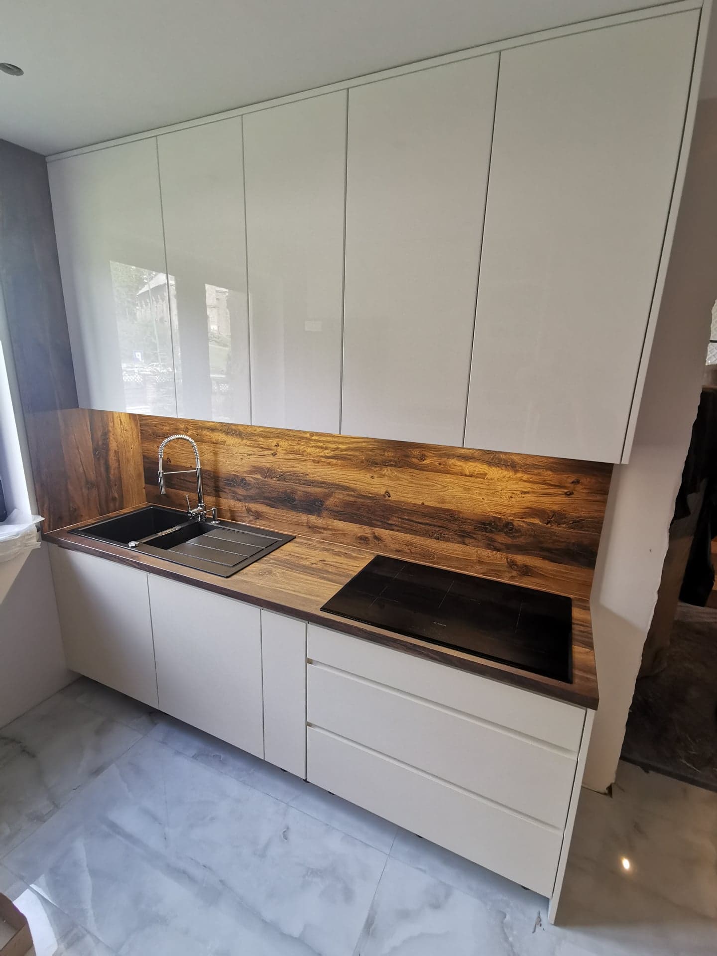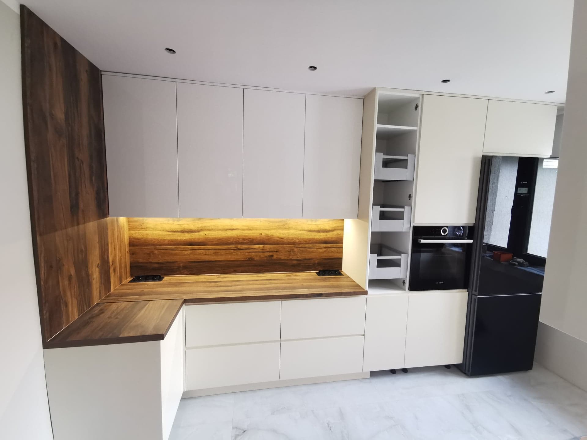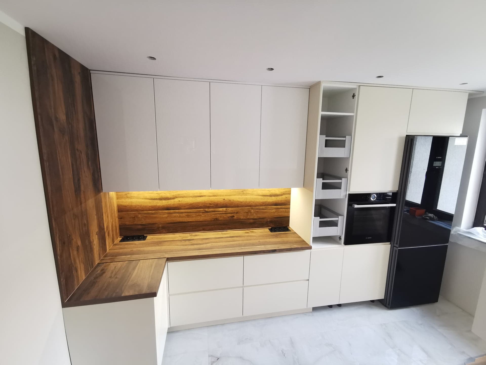 W poniższym projekcie oraz realizacji, nasz klient zdecydował o zabudowie nie tylko kuchni na wymiar, ale także częściowej zabudowy wnęki. Dzięki czemu poza meblami kuchennymi na wymiar, możemy pochwalić się także ogromną szafą na wymiar wykonaną do pomieszczenia sypialnianego. Do samej realizacji usługi kuchni na wymiar użyliśmy przede wszystkim akcentu drewna. Dzięki temu, kuchnie na wymiar stają się cieplejsze i zyskują znacznego akcentu! Drewnopodobny blat oraz zabudowa przestrzeni międzymeblowej, zdecydowanie dodała nie tylko jakości wizualnej ale także użytkowej. Zabudowa ta pozwoli chronić pomieszczenia w strefach wrażliwych na wodę czy przypadkowe zabrudzenia. Coraz większe grono klientów wybiera właśnię taką formę wykonania kuchni na wymiar, zabudowując wnętrza dodatkową płytą.