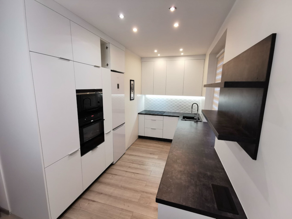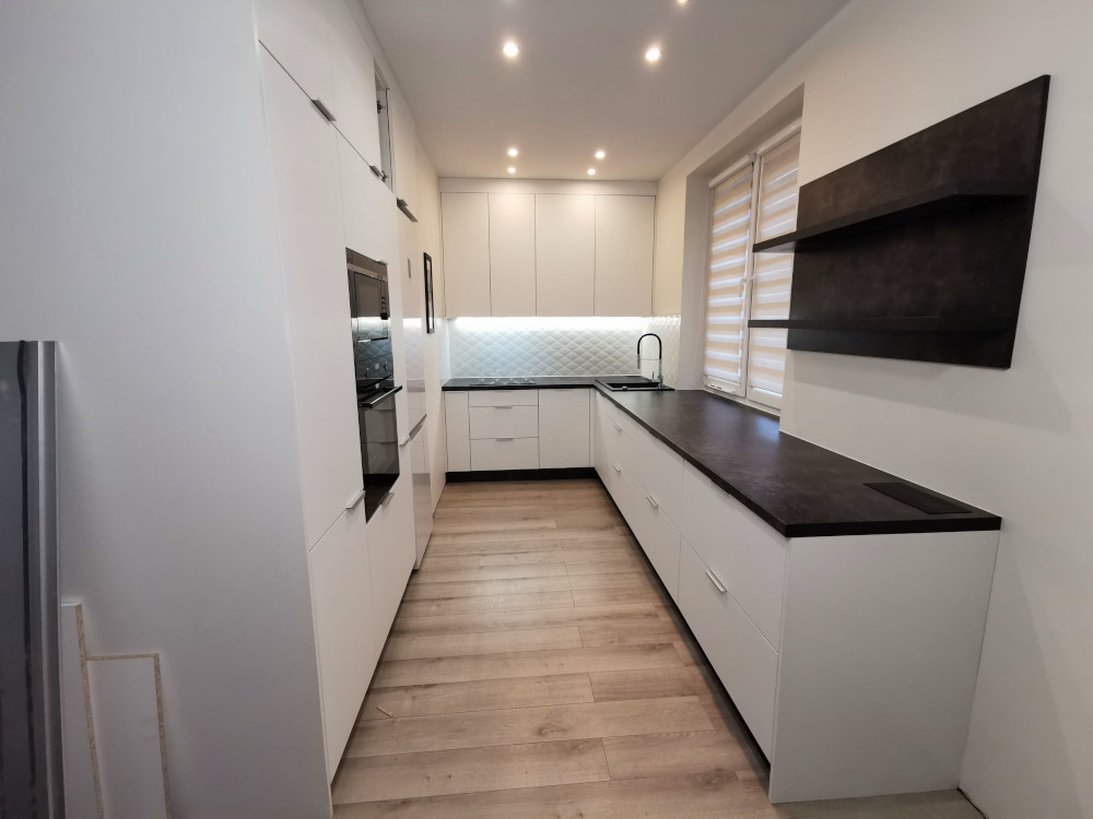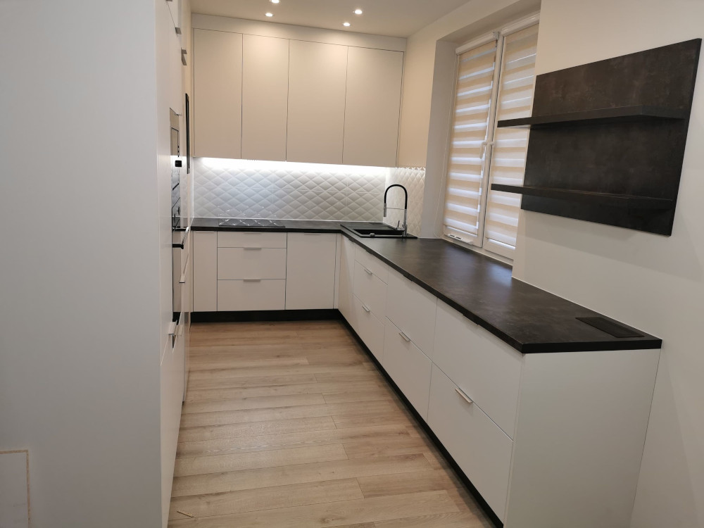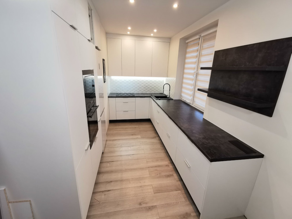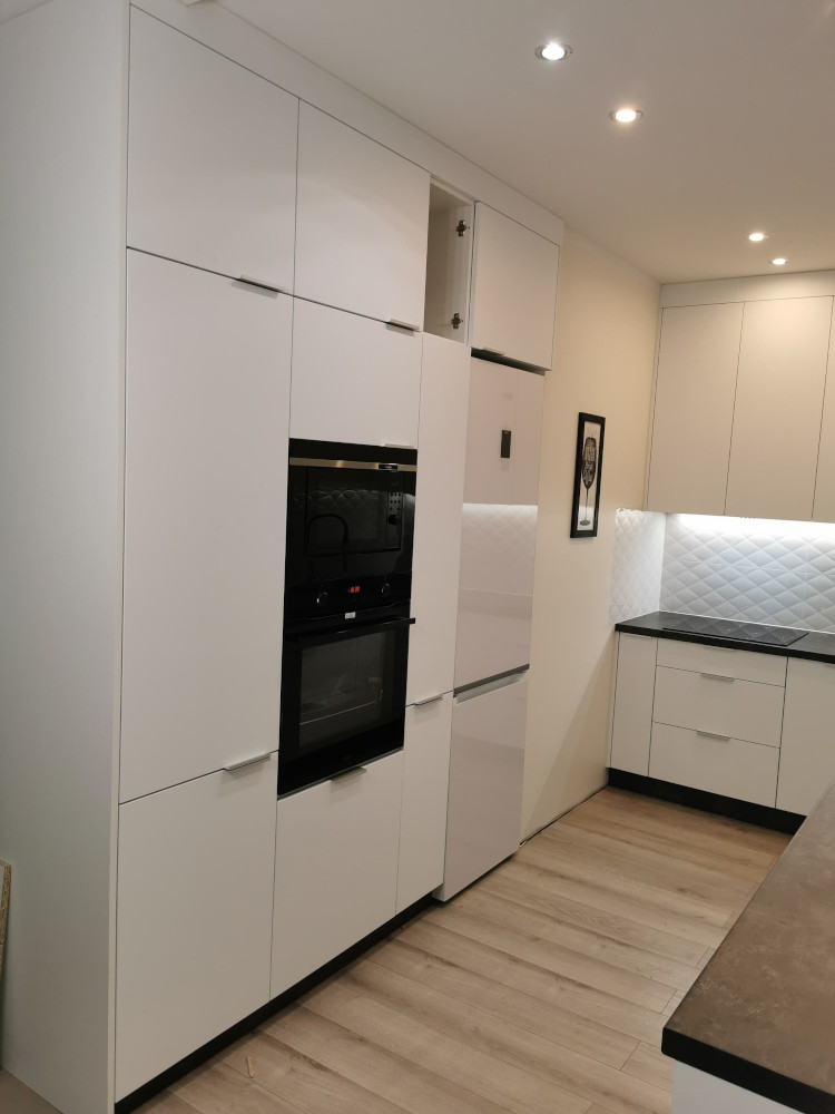 Do poniższego projektu mebli na wymiar w Świerzawie, dokonano pomiaru oraz projektu, następnie przystąpiono do realizacji. Sama biel, której użyto, otrzymała kontrast w postaci ciemnego blatu oraz specjalnie przygotowanej półki, która będzie w stanie przechowywać dodatkowo, wszelkie przyprawy. W samym projekcie użyto także bardzo popularnych gniazd elektrycznych, chowanych w blat. Dzięki temu udało się pominąć standardowo umieszczane gniazda podtynkowe w płytkach ściennych 3D, które umieszczone są pomiędzy blatem a górnymi meblami.