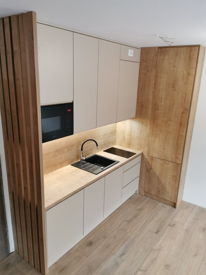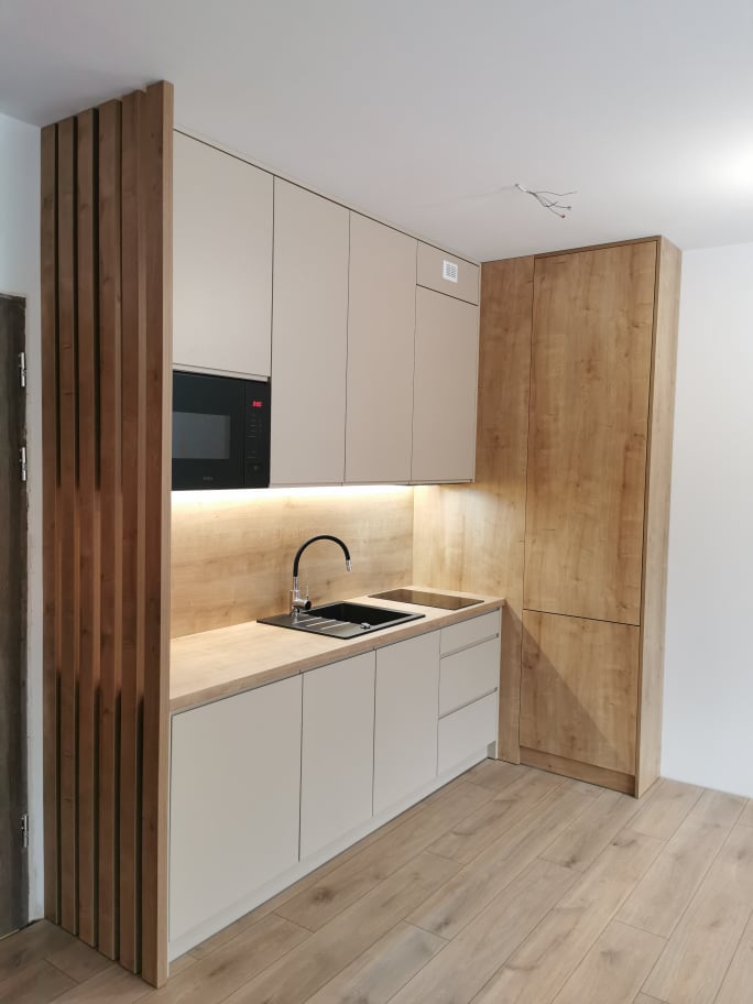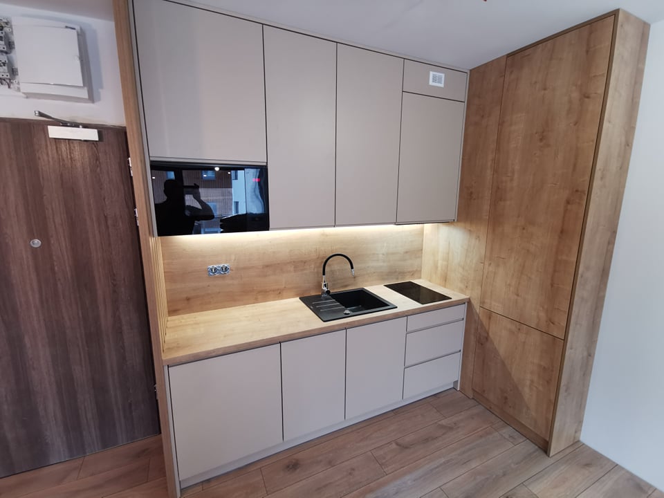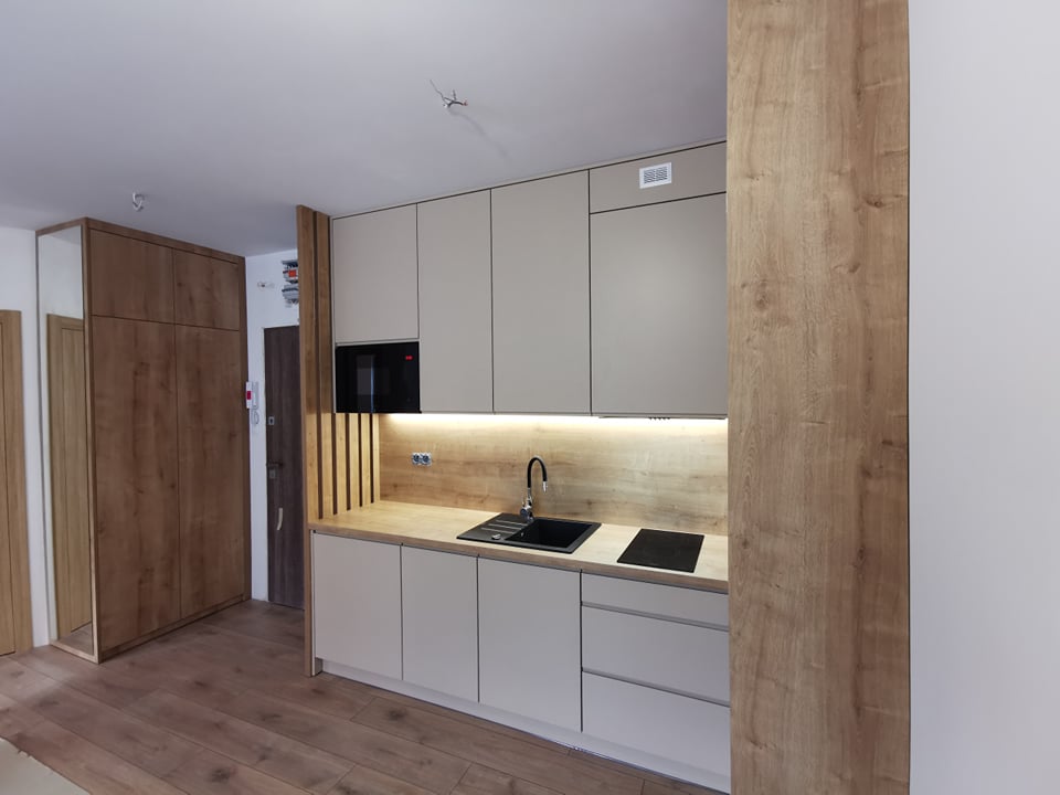 Dziś pragniemy pochwalić się Państwu kolejną realizacją. Jest to już kolejny projekt realizowany w miejscowości Szklarska Poręba. Poprzednie realizacje zostaną wspomniane poniżej a tymczasem kilka słów o aktualnej realizacji, o której mowa w dzisiejszym wpisie. Tym razem podczas realizacji projektu, wykonaliśmy meble w dość nietypowym zestawieniu. O ile najpopularniejsze rozwiązania to typowe drewno z białymi frontami, tak tym razem, jest inaczej. Do realizacji kuchni w nieruchomości naszego klienta, użyliśmy z jego pełną aprobatą, frontów kremowych. Dzięki temu sama część kuchenna zyskała wizualnie znacznie więcej ciepła.