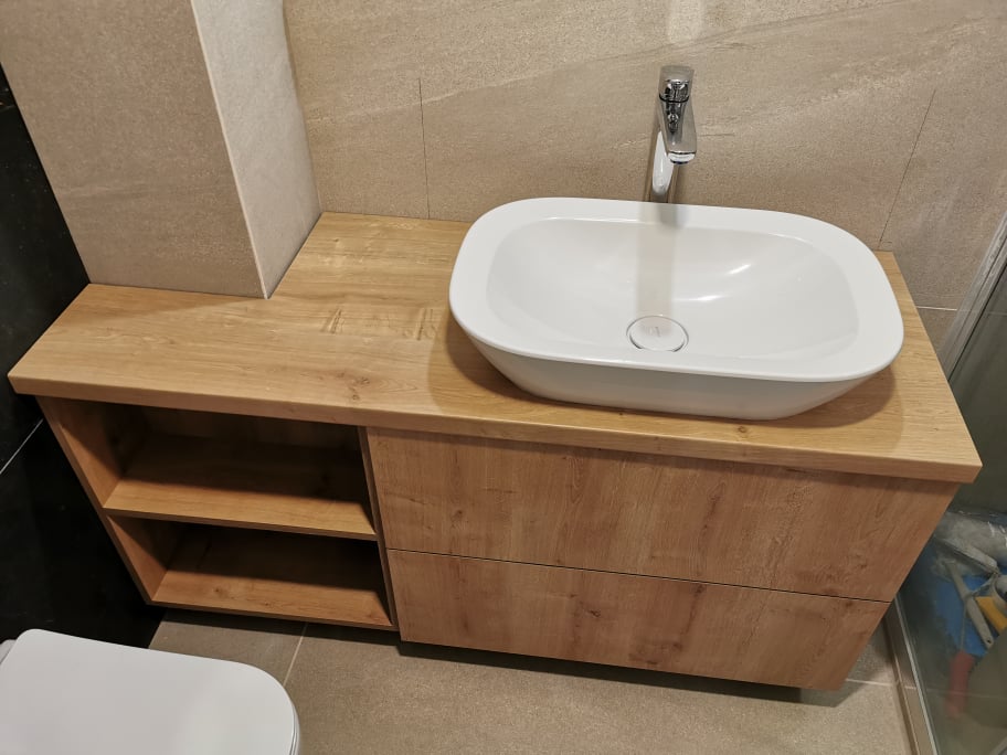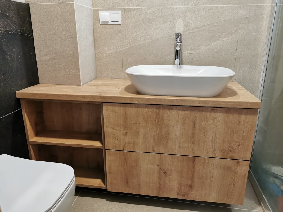 Łazienka wykonana w aktualnych trendach, przez co nie mogło zabraknąć umywalki nablatowej. Została ona usadowiona na wykonanej przez nas wcześniej szafce na wymiar z uwagi na ograniczoną powierzchnię, którą mieliśmy do dyspozycji. Oczywiście kanały wentylacyjne w budynku, nie ułatwiały nam sprawy, co nie znaczy, że były dla choćby najmniejszym problemem.