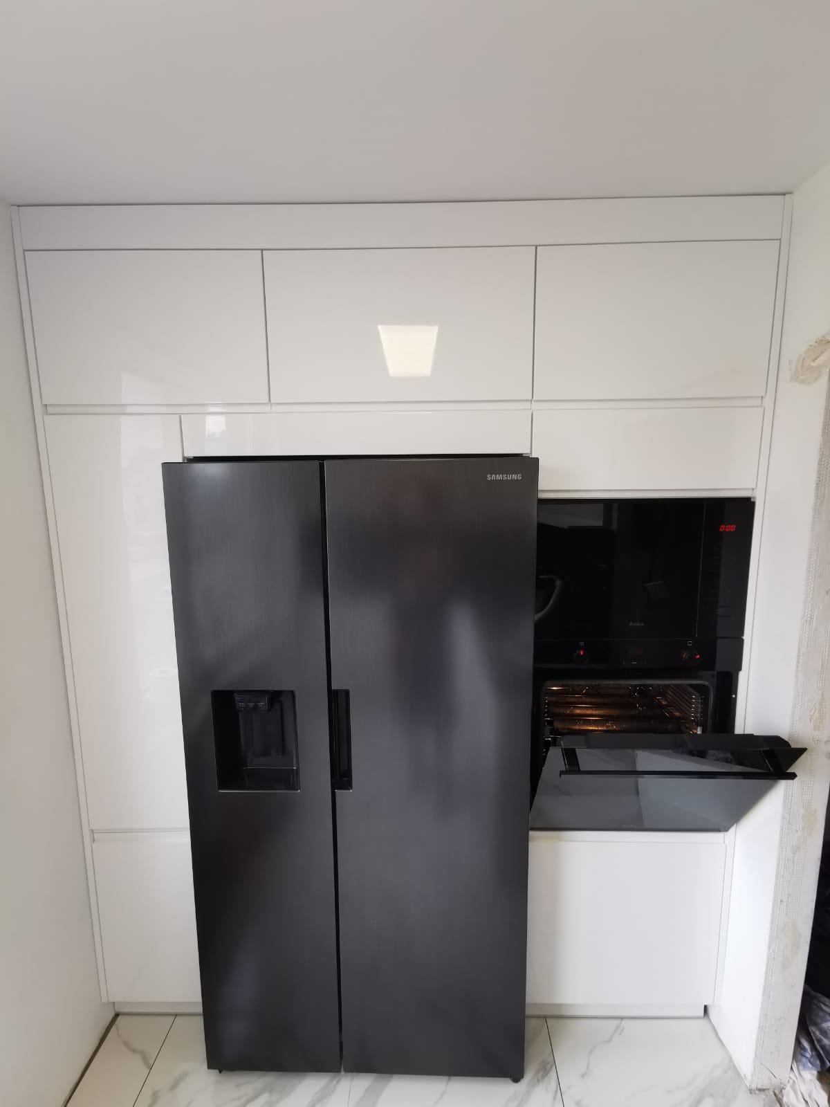 Na pierwszym zdjęciu widoczna jest zabudowa lodówki oraz piekarnika w zabudowie. Meble wykonane są z eleganckich, białych frontów o wysokim połysku, które nadają wnętrzu nowoczesny, minimalistyczny wygląd. Lodówka o ciemnej kolorystyce doskonale kontrastuje z jasnymi elementami kuchni, co dodaje całej aranżacji wyjątkowego charakteru.
