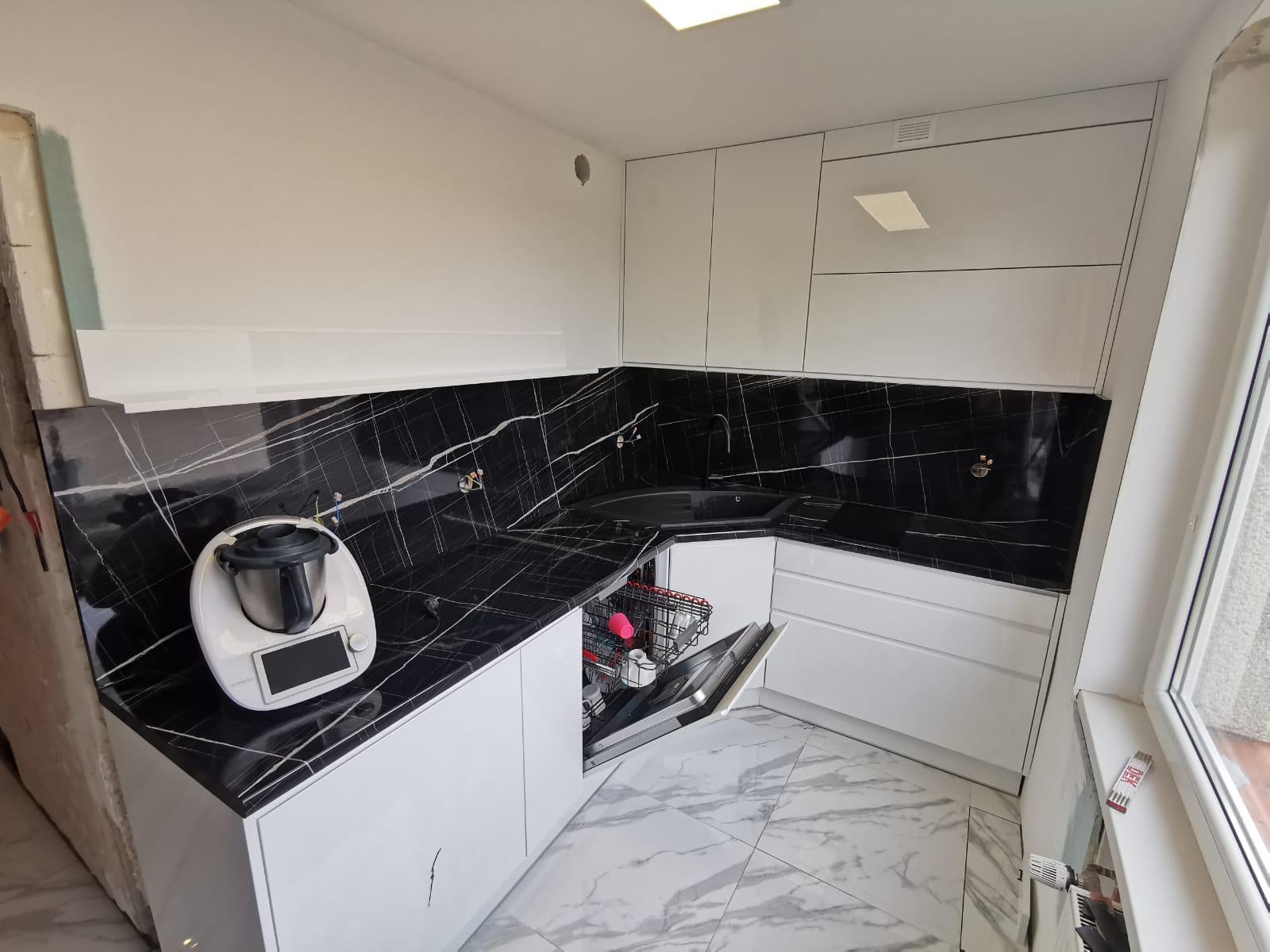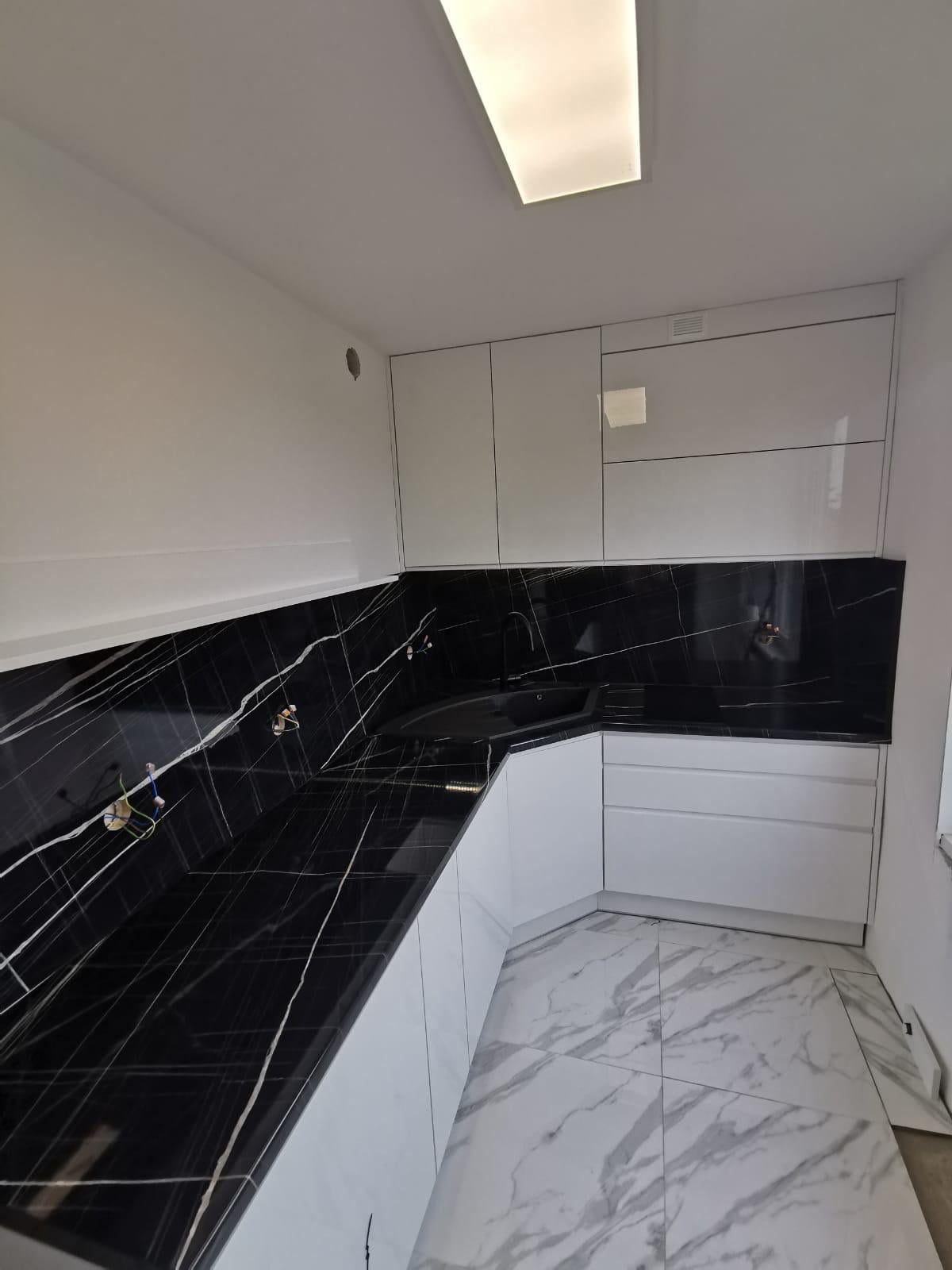 Na drugim zdjęciu przedstawiono większą część zabudowy kuchennej, w tym funkcjonalny blat z ciemnym, marmurowym wykończeniem z wyraźnymi jasnymi żyłkami, który dodaje elegancji i ekskluzywnego stylu. Czarne elementy, takie jak zlew, idealnie komponują się z blatem, a zastosowane wysokiej jakości materiały gwarantują trwałość i łatwość w utrzymaniu czystości. Zabudowa kuchni jest maksymalnie wykorzystana dzięki przemyślanemu układowi szafek, które oferują sporo przestrzeni do przechowywania.